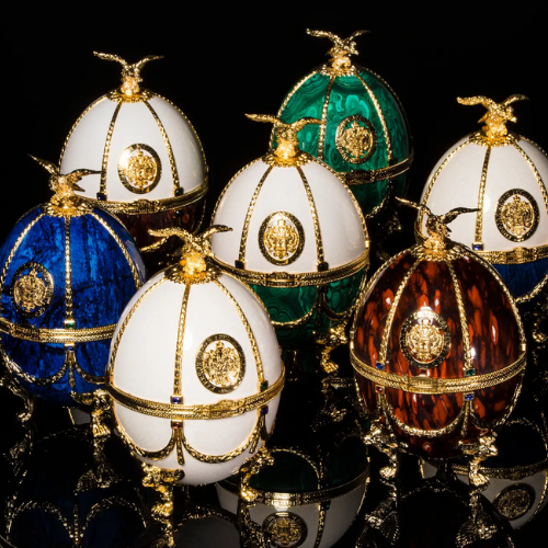 優美なヴェネツィアングラスのデキャンタに、ハンドメイドの装飾を施した4つのショットグラスをまとい、ファベルジェのイースターエッグにすっぽりと収まっています。美しさを追求した装飾部はシルバーで被われ、有色のスワロフスキーがアクセントに飾られています。上部のイーグルは、30年以上バチカンで働いていたフィレンツェの巨匠によって繊細にデザインされ、優美さをより際立たせています。
